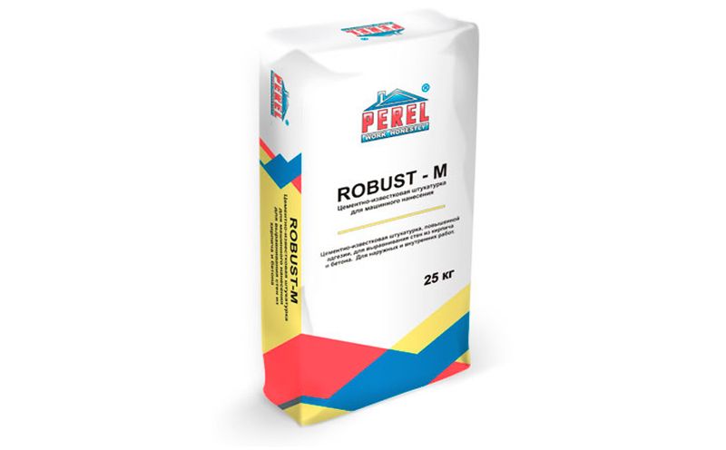 Цементно-известковая штукатурка 0514 Robust-M - смесь на основе цементно-известкового вяжущего для выравнивания стен из бетона, кирпича, газобетона, а также заделки стыков и отдельных неровностей бетонных и железобетонных плит для внутренних и наружных работ, в сухих и влажных помещениях. Для ручного и машинного нанесения.