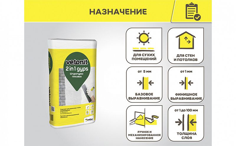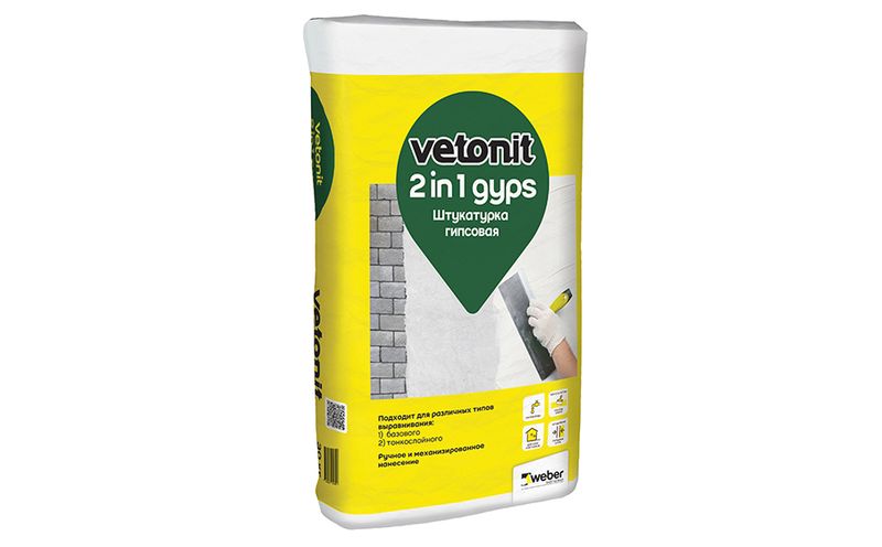 Штукатурка гипсовая weber.vetonit 2 in 1 gyps предназначена для базового и финишного выравнивания стен и потолков слоем 1-50 мм (локально до 100 мм).